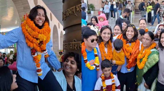 दून एयरपोर्ट पर स्नेह राणा का ढोल नगाड़ों से स्वागत