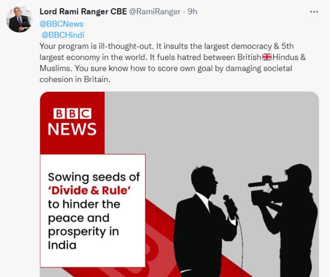 लॉर्ड रामी रेंजर ने प्रधानमंत्री नरेंद्र मोदी पर हमला करने वाली एक न्यूज सीरीज को लेकर बीबीसी की कड़ी आलोचना की है। बीबीसी की निंदा करते हुए रेंजर ने उसपर पक्षपाती रिपोर्टिंग का आरोप लगाया है।