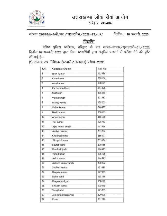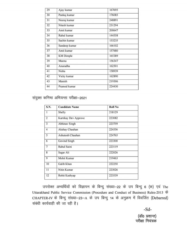 उत्तराखंड लोक सेवा आयोग ने परीक्षा में धांधली करने वाले अभ्यर्थियों के नाम सार्वजनिक कर दिए गए हैं। इनमें 44 नाम पटवारी लेखपाल परीक्षा 2022 में शामिल अभ्यर्थियों के हैं। 12 नाम संयुक्त कनिष्क अभियंता परीक्षा 2021 के अभ्यर्थियों के हैं।
