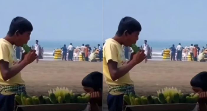 वीडियो में साफ देखा जा सकता है कि एक लड़का अपने ठेले पर खीरे बेच रहा था। आसपास काफी लोग घूमते-फिरते नजर आ रहे थे क्योंकि यह जगह समंदर किनारे का लग रहा था। आमतौर पर लोग गर्मी में ठंडक पाने के लिए खीरे खाना पसंद करते हैं, लेकिन इस ठेले वाले ने जिस तरह का तरीका अपनाया, उसने सभी को चौंका दिया। वह लड़का छिला हुआ खीरा अपने मुंह में डालकर उस पर थूक लगाता है और फिर उसे चमकाने की कोशिश करता है ताकि खीरा नया और अच्छा दिखे।