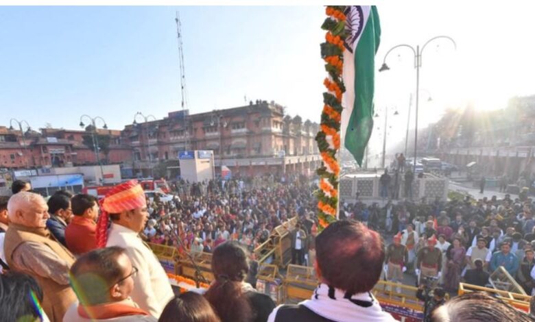 देश के 77वें गणतंत्र दिवस पर जयपुर देशभक्ति के रंग में डूबा नजर आया। मुख्यमंत्री भजनलाल शर्मा ने मुख्यमंत्री निवास, बड़ी चौपड़ और भाजपा मुख्यालय पर ध्वजारोहण किया। उन्होंने अमर जवान ज्योति पर शहीदों को श्रद्धांजलि दी और एसएमएस स्टेडियम में राज्य स्तरीय समारोह में परेड की सलामी ली। सचिवालय सहित शहर भर के सरकारी और सामाजिक संस्थानों में तिरंगा फहराया गया और सांस्कृतिक कार्यक्रमों के जरिए एकता का संदेश दिया गया।