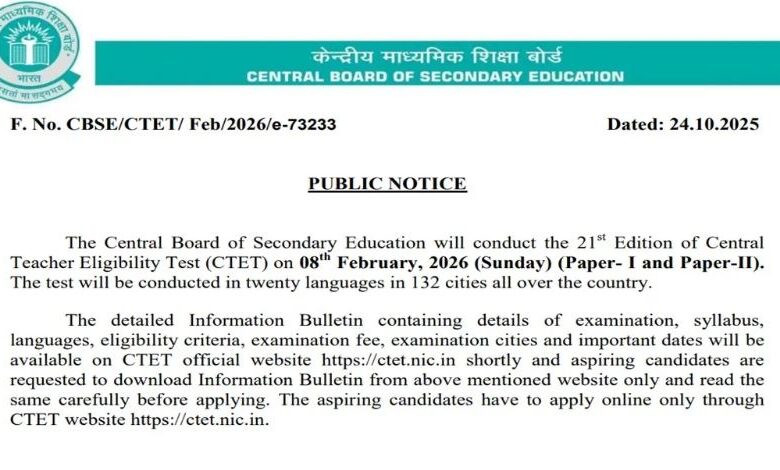 सीबीएसई की आधिकारिक अधिसूचना के मुताबिक CBSE CTET परीक्षा का आयोजन 132 शहरों में 08 फरवरी, 2026 को किया जाएगा। सीबीएसई इस बार अपना 21वां संस्करण (पेपर- I और पेपर- II) आयोजित करेगा। यह परीक्षा कुल 20 भाषाओं में आयोजित कराई जाएगी। इसके साथ ही परीक्षा, पाठ्यक्रम, भाषा, पात्रता मानदंड, परीक्षा शुल्क, परीक्षा शहर और तिथियों की विस्तृत जानकारी जल्द ही वेबसाइट ctet.nic.in पर जारी कर दी जाएगी।