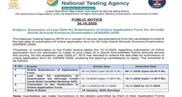 नेशनल टेस्टिंग एजेंसी की ओर से सैनिक स्कूल एडमिशन (AISSEE 2026) के लिए रजिस्ट्रेशन की अंतिम तिथि बढ़ा दी गई है। बता दें, सैनिक स्कूल में कक्षा 6वीं से लेकर 9वीं में दाखिला लेने के लिए रजिस्ट्रेशन करने की अंतिम तिथि आज यानी 30 अक्टूबर निर्धारित की गई थी। लेकिन एनटीए की ओर से रजिस्ट्रेशन करने की अंतिम तिथि को बढ़ा दिया गया है। अब वे माता-पिता भी अपने बच्चों के दाखिले के लिए रजिस्ट्रेशन कर सकेंगे, जो किसी कारणवश समय रहते रजिस्ट्रेशन नहीं कर सके थे। सैनिक स्कूल में रजिस्ट्रेशन करने की अंतिम तिथि अब 09 नवंबर, 2025 निर्धारित की गई है।