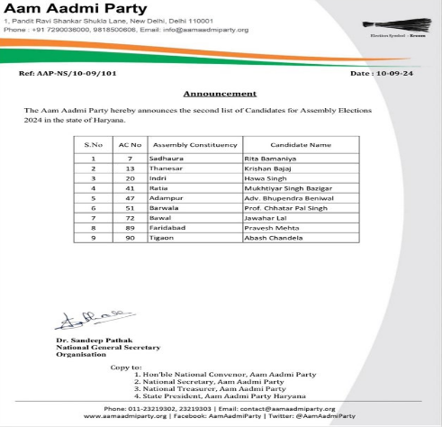 ‘AAP’ ने हरियाणा में जारी की दूसरी लिस्ट