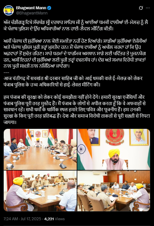 पंजाब CM भगवंत मान ने चंडीगढ़ में सचखंड श्री दरबार साहिब जी को मिली धमकी भरी ईमेल्स के मामले को लेकर पंजाब पुलिस के उच्च अधिकारियों के साथ एक हाई-लेवल मीटिंग की।